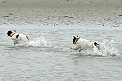 Aout 2020 à St Jacut de la Mer. Qui a dit que les bouledogues n'aiment pas l'eau ? La mer attire les notres comme un aimant. Qui arrivera le premier ? |
